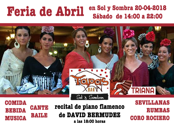 Gdy cała Sewilla świętuje swoją Ferię, my w Warszawie spotykamy się w barze tapas Sol y Sombra, aby również bawić się w rytmie sevillanas i rumbas. Zapraszamy serdecznie w sobotę 21 kwietnia w godzinach 14:00 – 22:00 do Sol y Sombra (ul. Grzybowska 2). Będą tańce i śpiewy, dzięki popisom naszego chóru Coro Rociero de Triana, a także gwóźdź programu: recital piano flamenco w wykonaniu pianisty z Barcelony – Davida Bermudeza (ok. godz. 18.00).